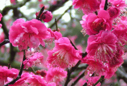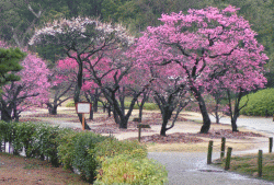 Ritsurin-Park in Takamatsu auf Shikoku mit blühenden Pflaumenbäumen, kunstvoll gestalteten Kiefern und Kois in allen Farben | |