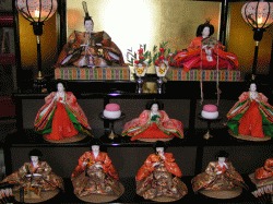 In Vorbereitung auf das traditionelle japanische Puppenfest am 3. März (ein Familienfest zu Ehren der Mädchen) trafen wir auf zahlreiche kunstvoll gestaltete Puppenarrangements. | |